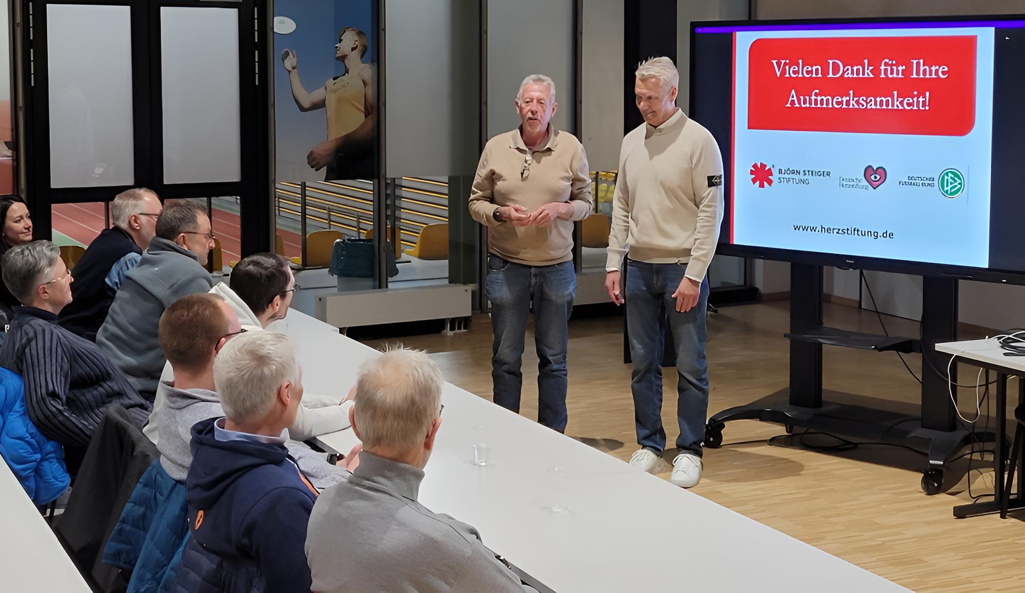Alle acht Minuten stirbt in Deutschland ein Mensch am plötzlichen Herztod. Im Mittelpunkt stand die Frage, wie Sportler im Notfall schnell und sicher handeln können. „Gerade im Ausdauerbereich kommt es immer wieder zu plötzlichen Herzstillständen und dann zählt jede Sekunde“, erklärte Göbel zu Beginn. Mit seiner praxisnahen Art führte er die Teilnehmenden durch die wichtigsten Schritte der Wiederbelebung: Erkennen eines Herzstillstands, Notruf, Herzdruckmassage und der Einsatz eines automatisierten externen Defibrillators (AED).