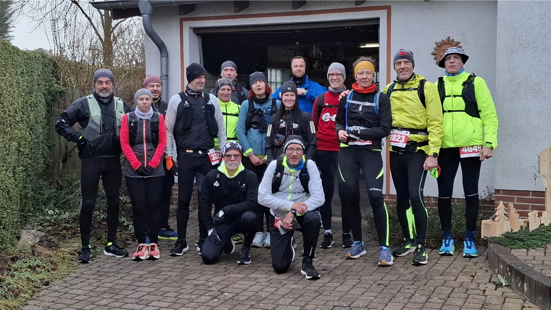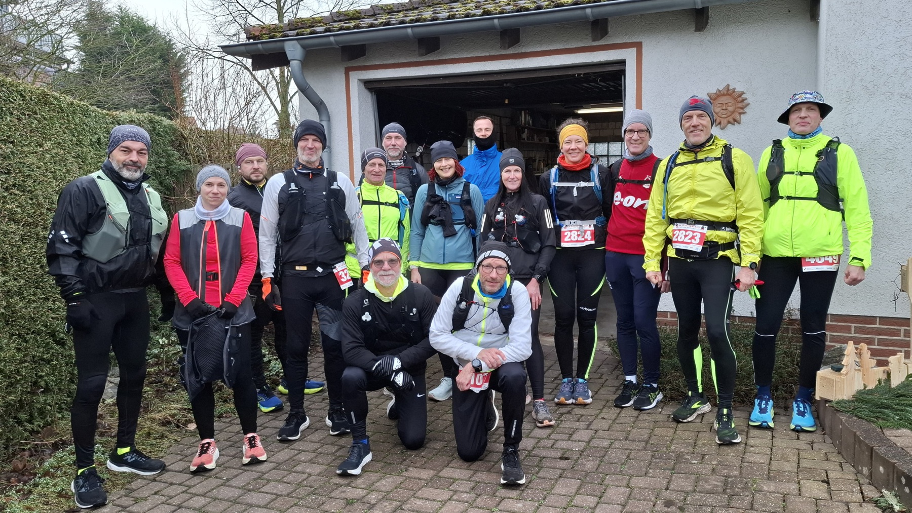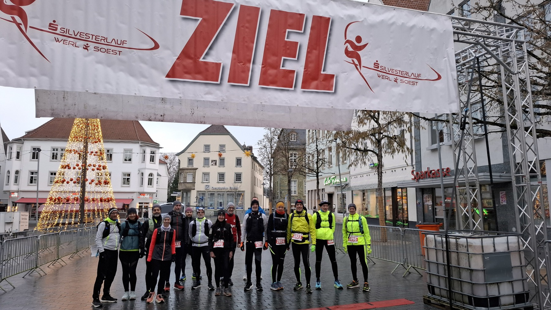 22 Marathonis machten sich am Silvestermorgen auf den Weg. 28 km Prolog lagen erstmal vor uns, als wir um 9:30 Uhr auf dem Soester Marktplatz starteten, während gerade der Zielbereich für den Silvesterlauf aufgebaut wurde. Etappe 1 führte uns über 15 km nach Welver, wo wir nach etwas Kletterei im Welveraner Wald den VP in unserer Garage genossen. Anschließend führte uns die Etappe 2 über 13 km nach Werl, wo wir pünktlich zum Start des Silvesterlaufs eintrudelten.